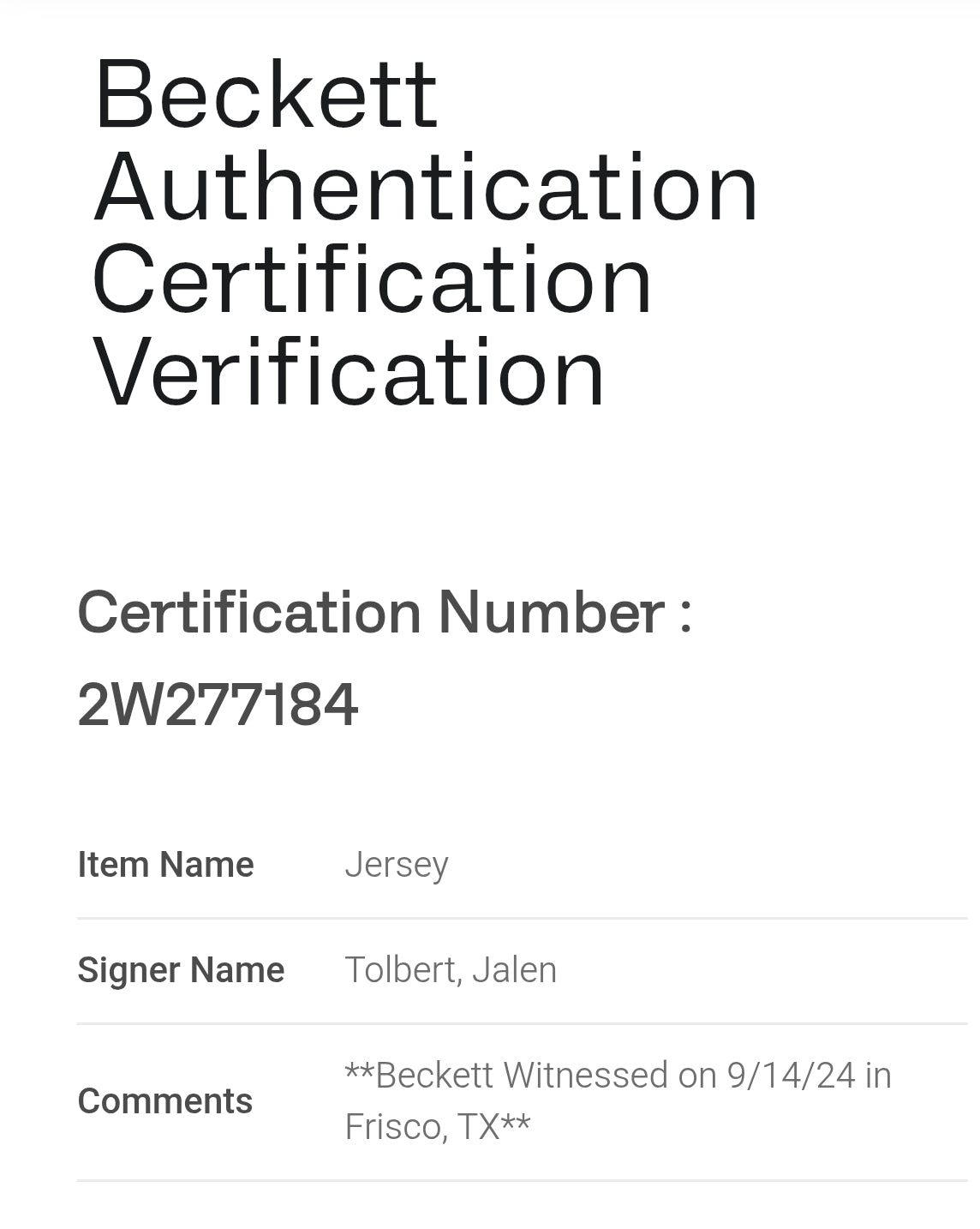 Beckett Authentication No: 2W277184
