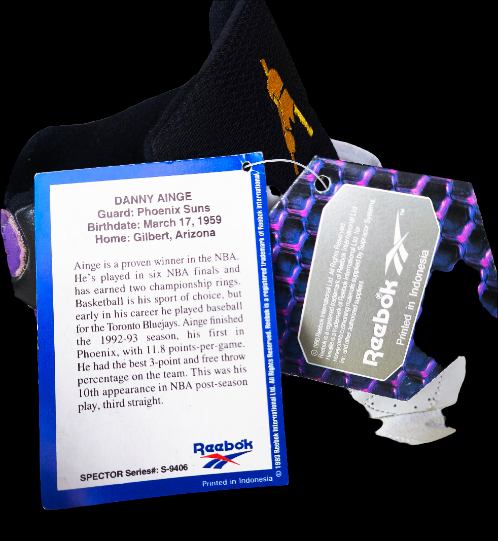 Rare original Reebok Above the Rim basketball sneakers from the 1990s, complete with the Danny Ainge Phoenix Suns hang tag. These shoes are deadstock (never worn) and come in size UK 4 / EU 36 / US Men’s 4.5